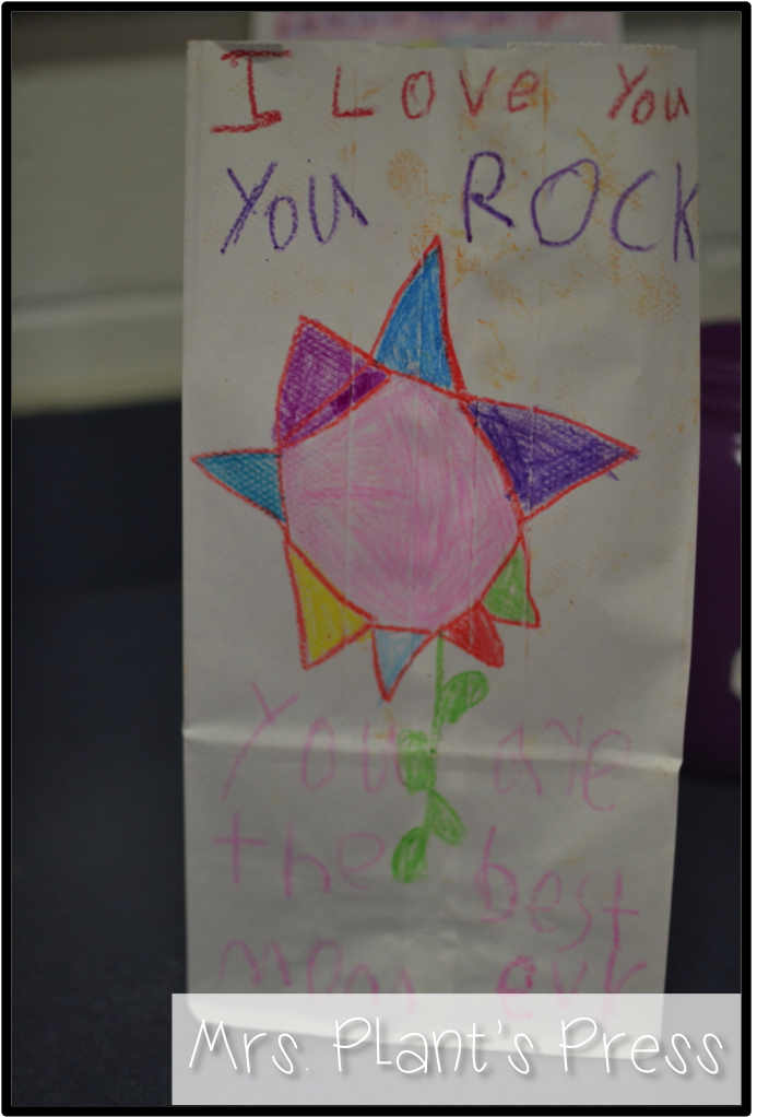 Just like last year, we made breakfast in a bag for our moms. I let the kids decorate bags, tie a little poem to it, and the kids filled it with a honey bun, granola bar, water, and a "fancy" napkin. They were so excited to make the bags for their moms! We also included our cards to our moms in the bag. You can grab the card and breakfast in bed poem template here.